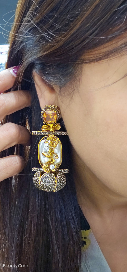 Gold Plated Silver Stone Allured with Silver Craft, and Ink Blue Beaded Earrings