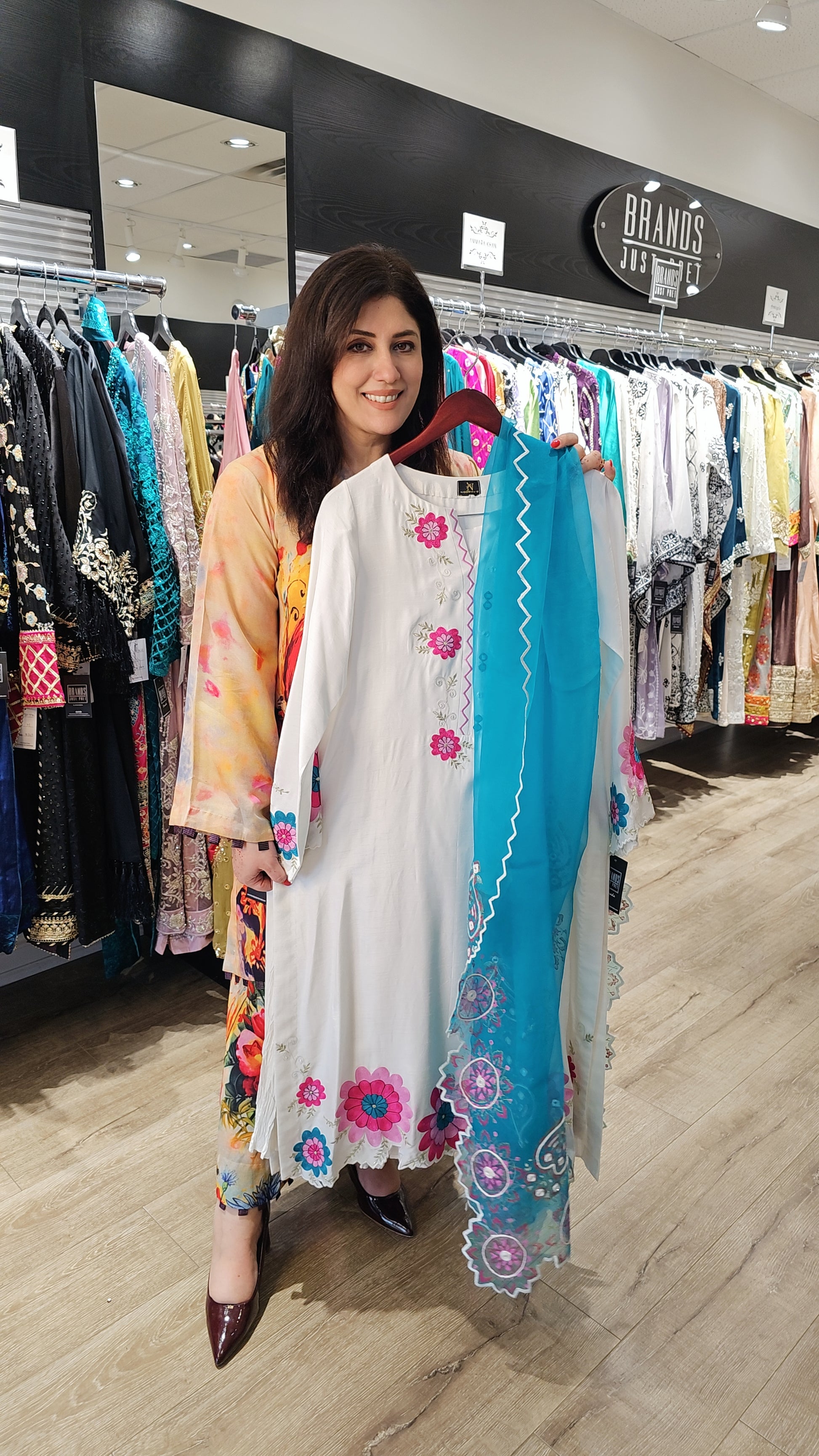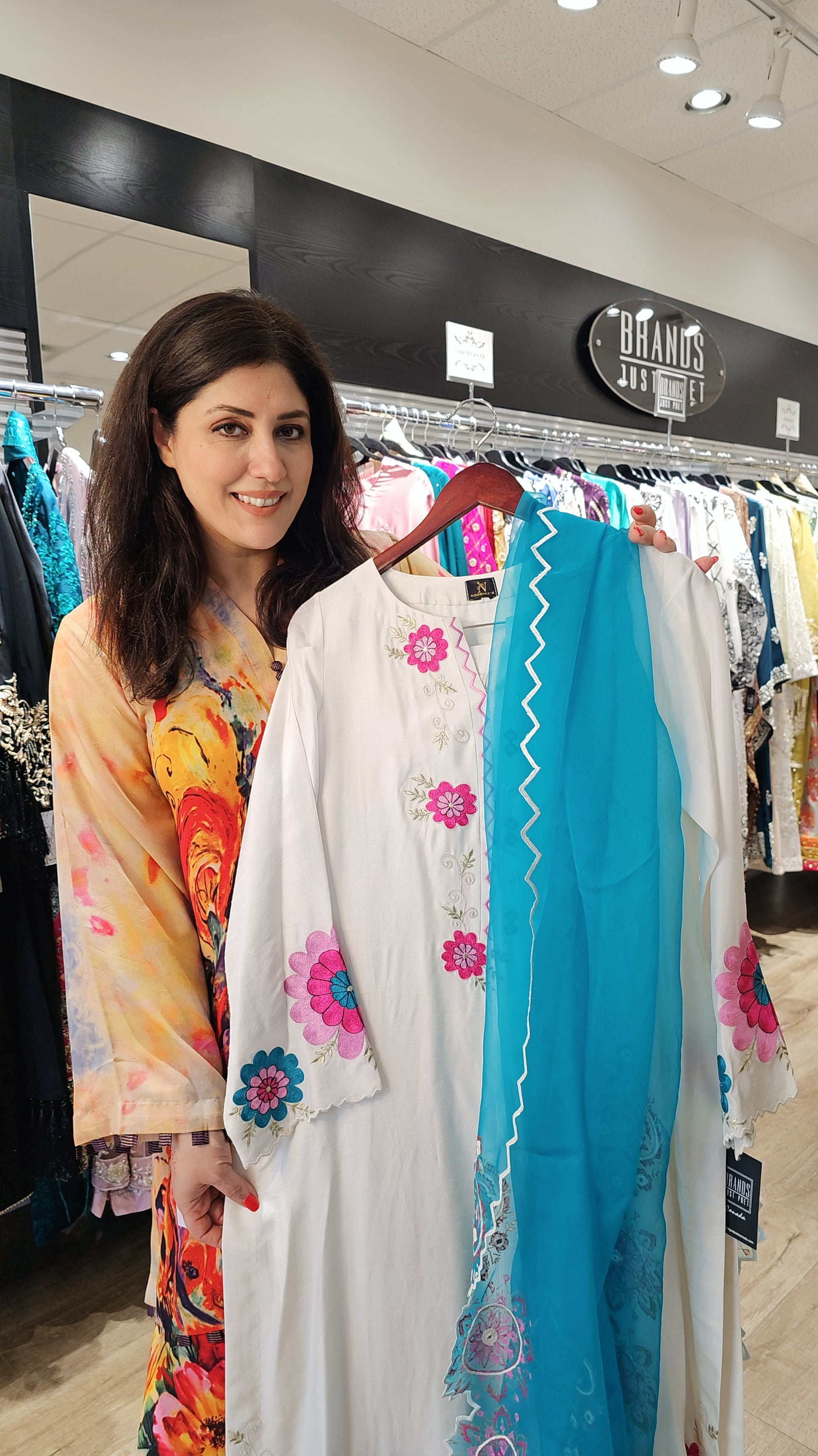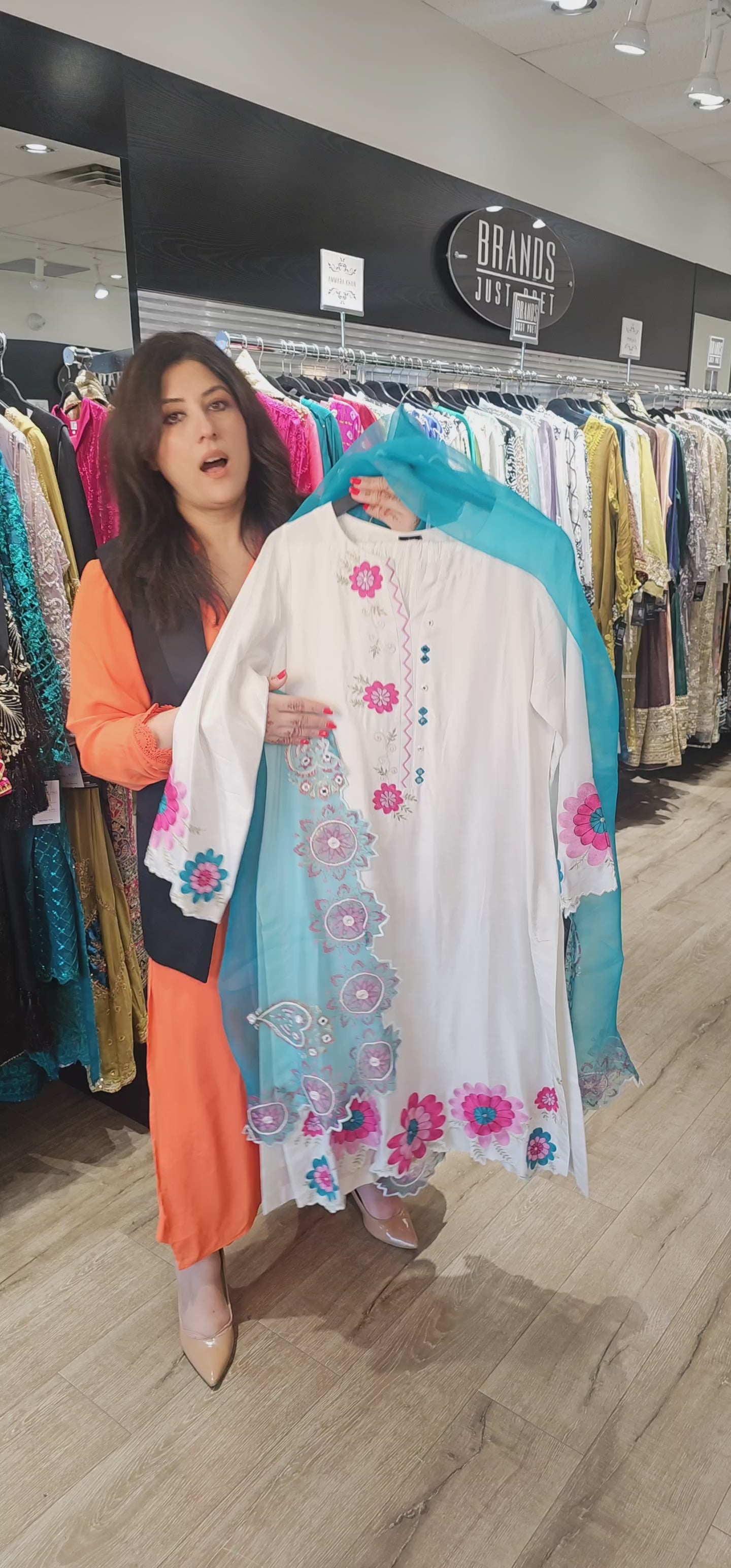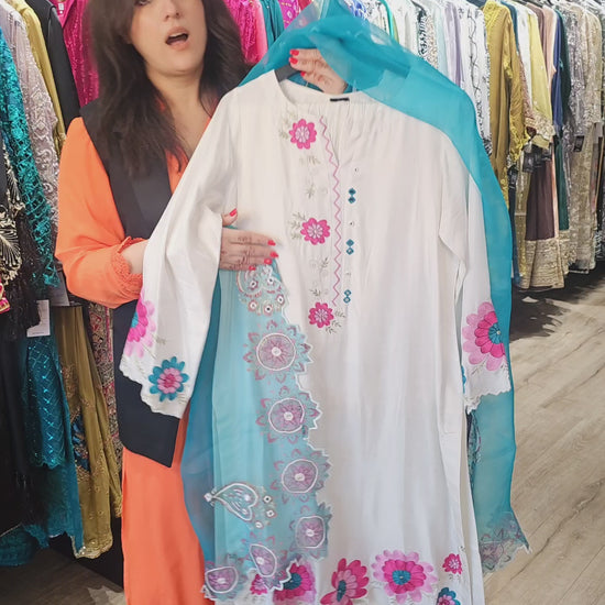 This 3 pc ensemble features a blue and white silk shirt adorned with thread intricate sequence and rhinestones embellishments. The embroidered organza dupatta is finished with Pink, white and blue work on all four sides and paired with white crush pants. A sophisticated and elegant choice for formal occasions.