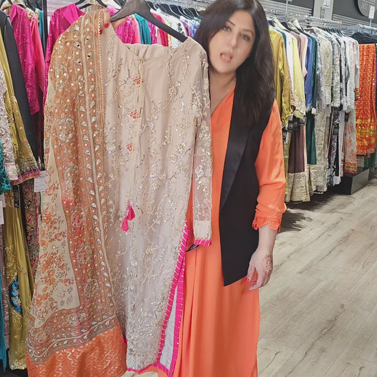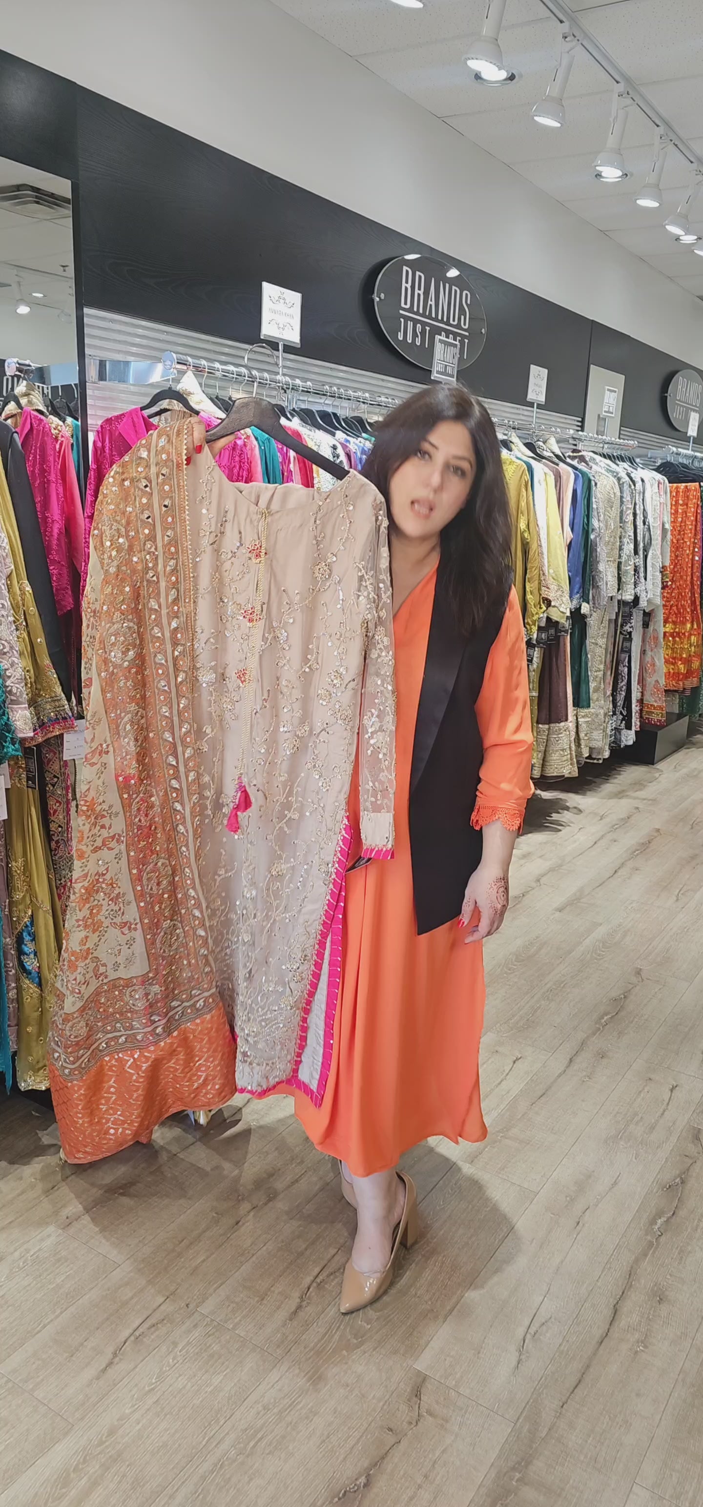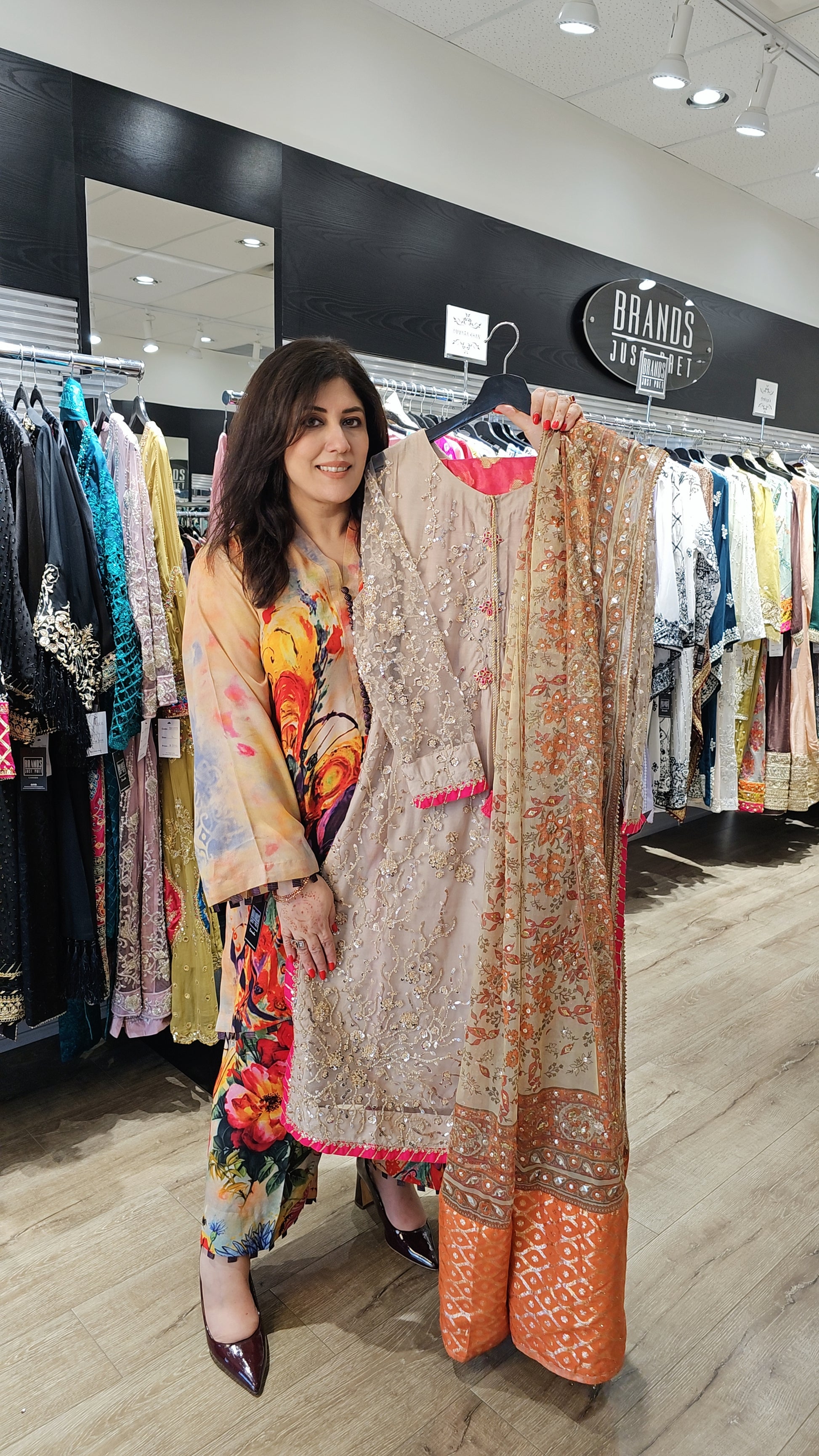 This Skin/ gold net cutdana fabric outfit features two pieces of finely crafted net fabric adorned with exquisite cutdana work for a subtle yet elegant sparkle. Enhanced with delicate pink contrast lace stitching, the ensemble balances traditional artistry with modern design, offering both sophistication and comfort for refined occasions.