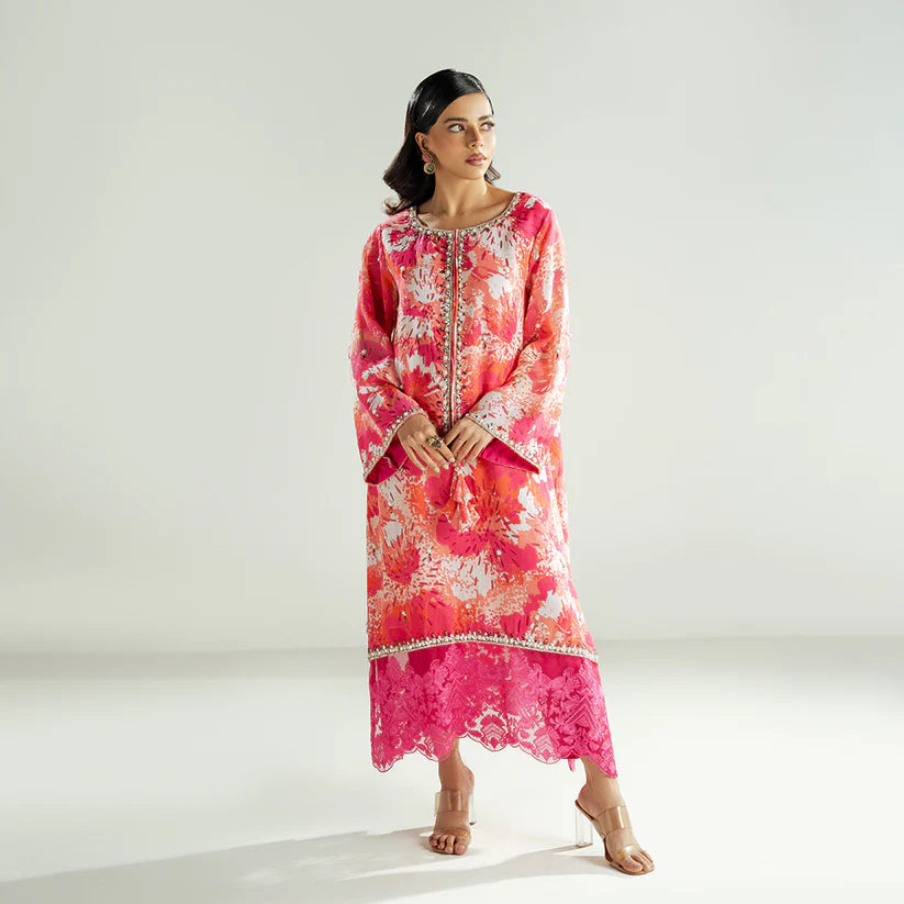 This Pink Brochia Ready-to-Wear outfit features exquisite hand and lace work on premium brochia fabric, blending traditional craftsmanship with contemporary style. The delicate embroidery and lace details elevate its elegance, making it perfect for special occasions that demand sophistication and comfort. Designed with attention to detail, this ensemble offers both refined aesthetics and a flattering fit.