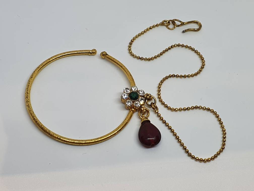 Antique Gold Hoop Nose Ring with Red Stone and Chain