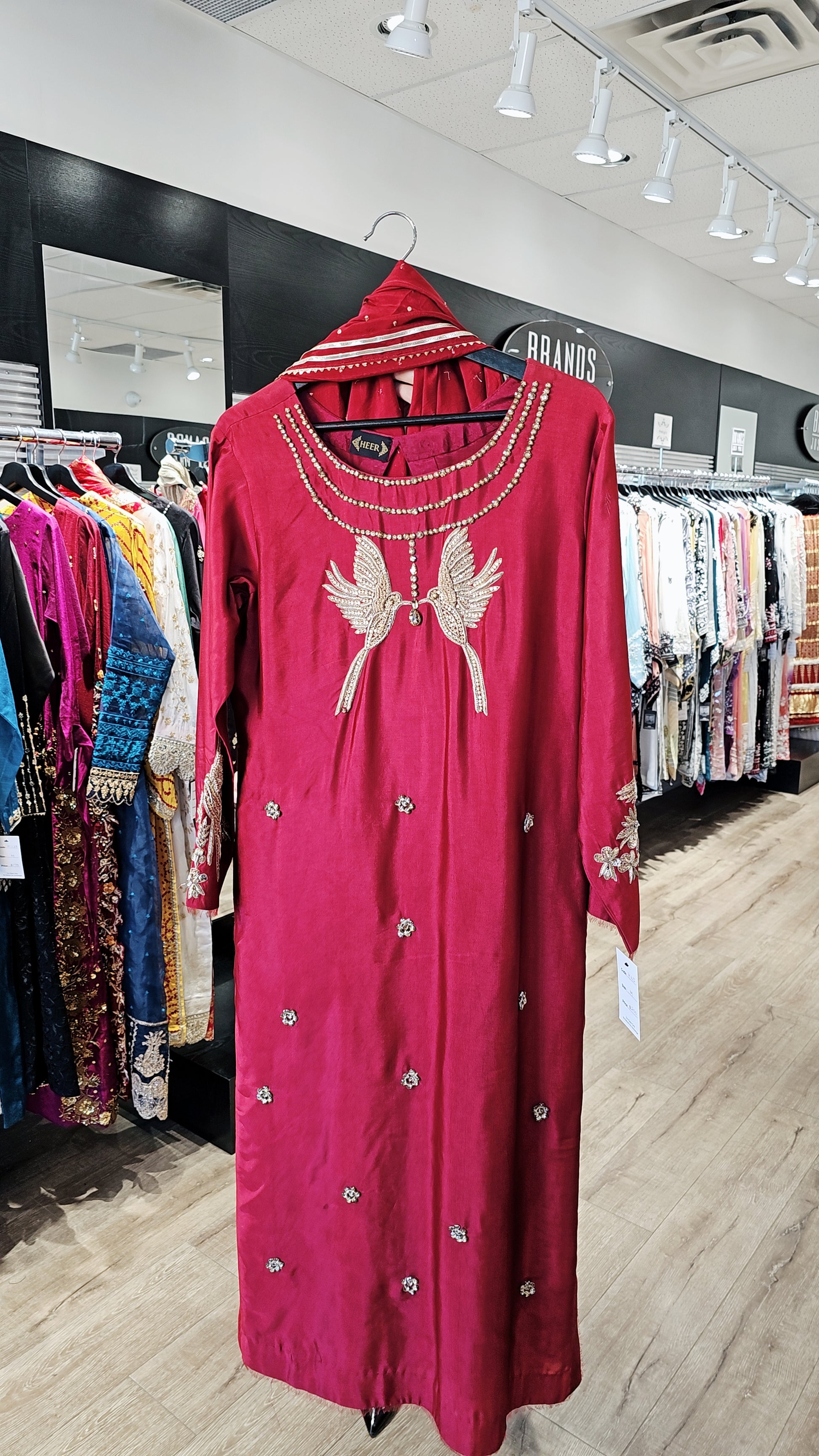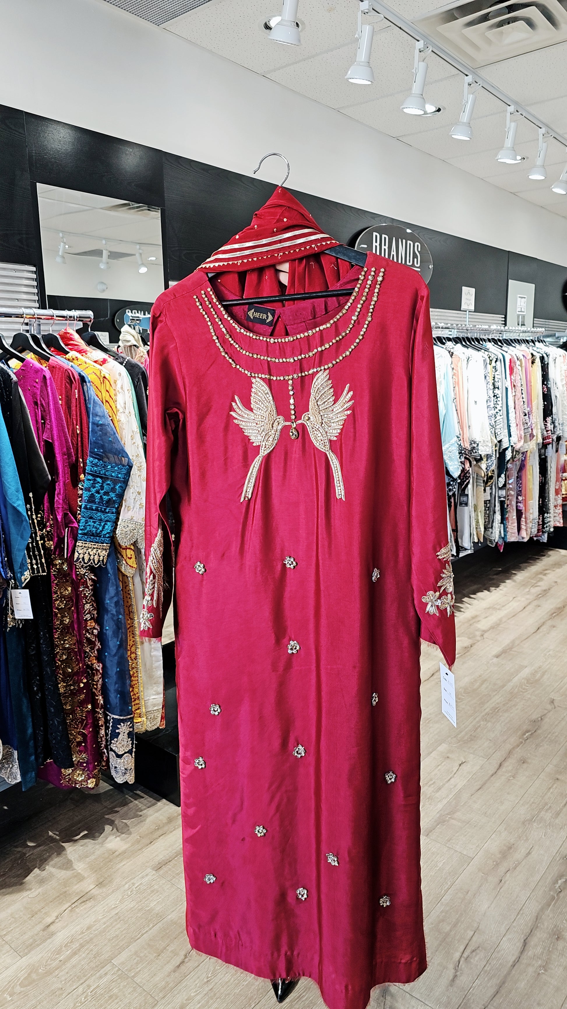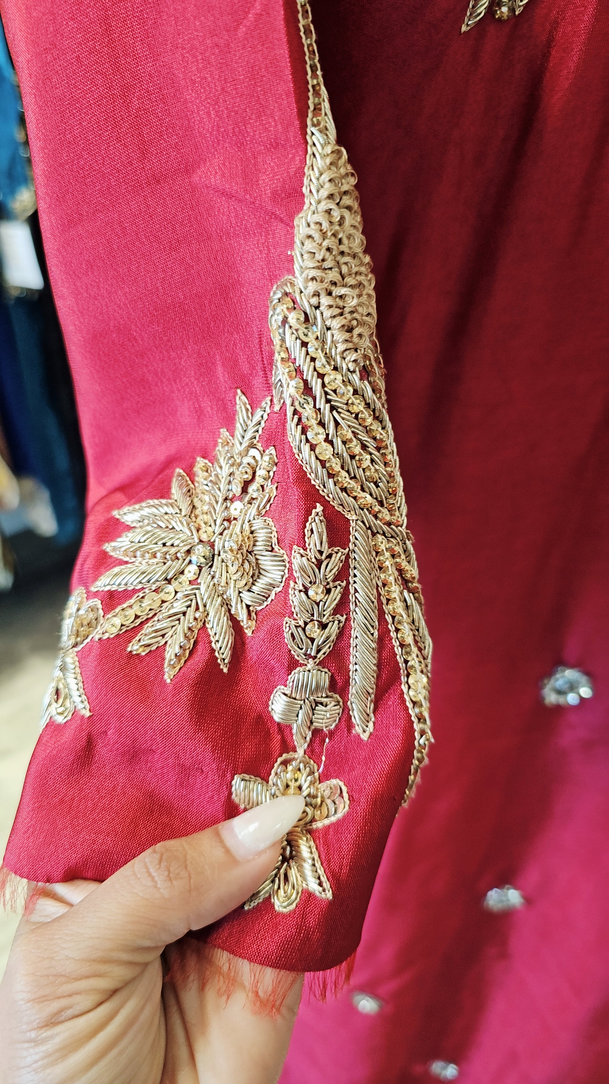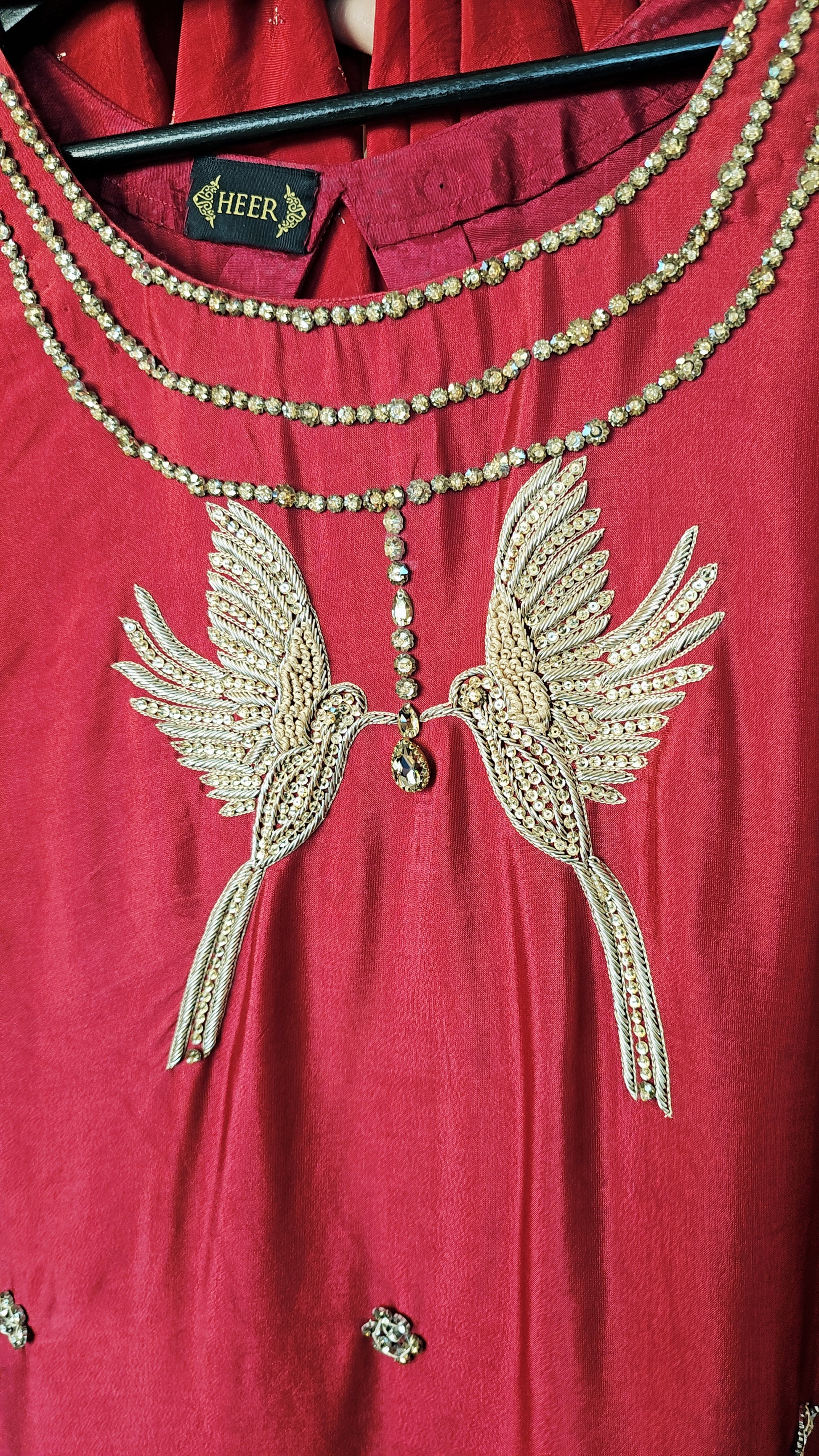 The exquisite red fabric glistens, inviting admiration. Delicate gold embellishments trace the contours of graceful bird motifs, adding a touch of elegance. This outfit showcases a harmonious blend of tradition and artistry. Its flowing design promises both comfort and a captivating presence. Wearing this outfit will undoubtedly make a statement.
