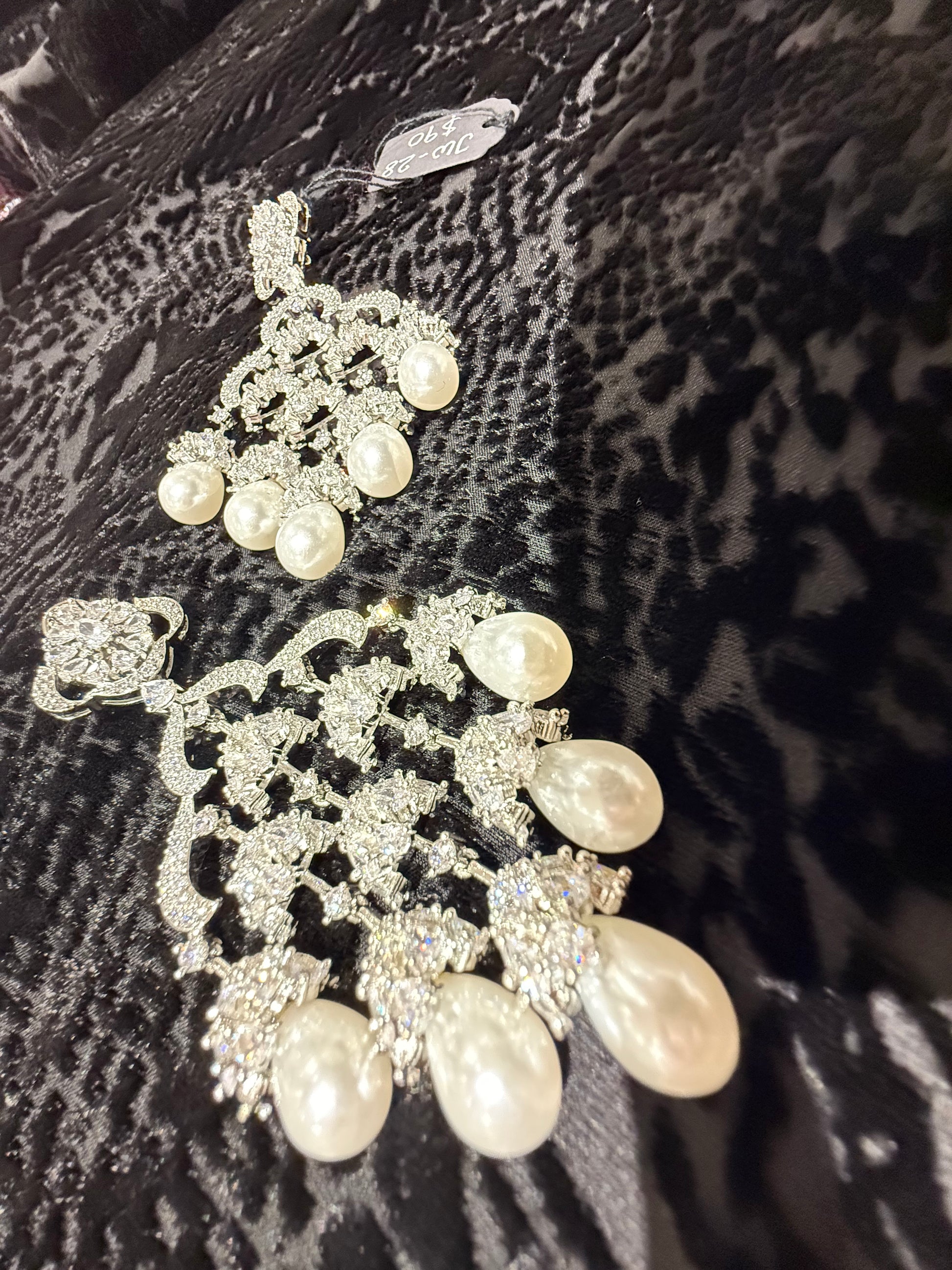 Elevate your elegance with these stunning pearl drop crystal chandelier earrings, designed to make a luxurious statement. Featuring intricate silver-tone craftsmanship adorned with sparkling crystals, these earrings are beautifully finished with lustrous teardrop pearls that add timeless charm. The graceful layered design creates a rich, royal look while remaining lightweight and comfortable for extended wear. Perfect for weddings, receptions, parties, and festive celebrations, these earrings pair effortlessly with lehengas, sarees, gowns, and fusion outfits. A perfect blend of classic pearls and modern sparkle, they are an essential accessory for refined, glamorous style.