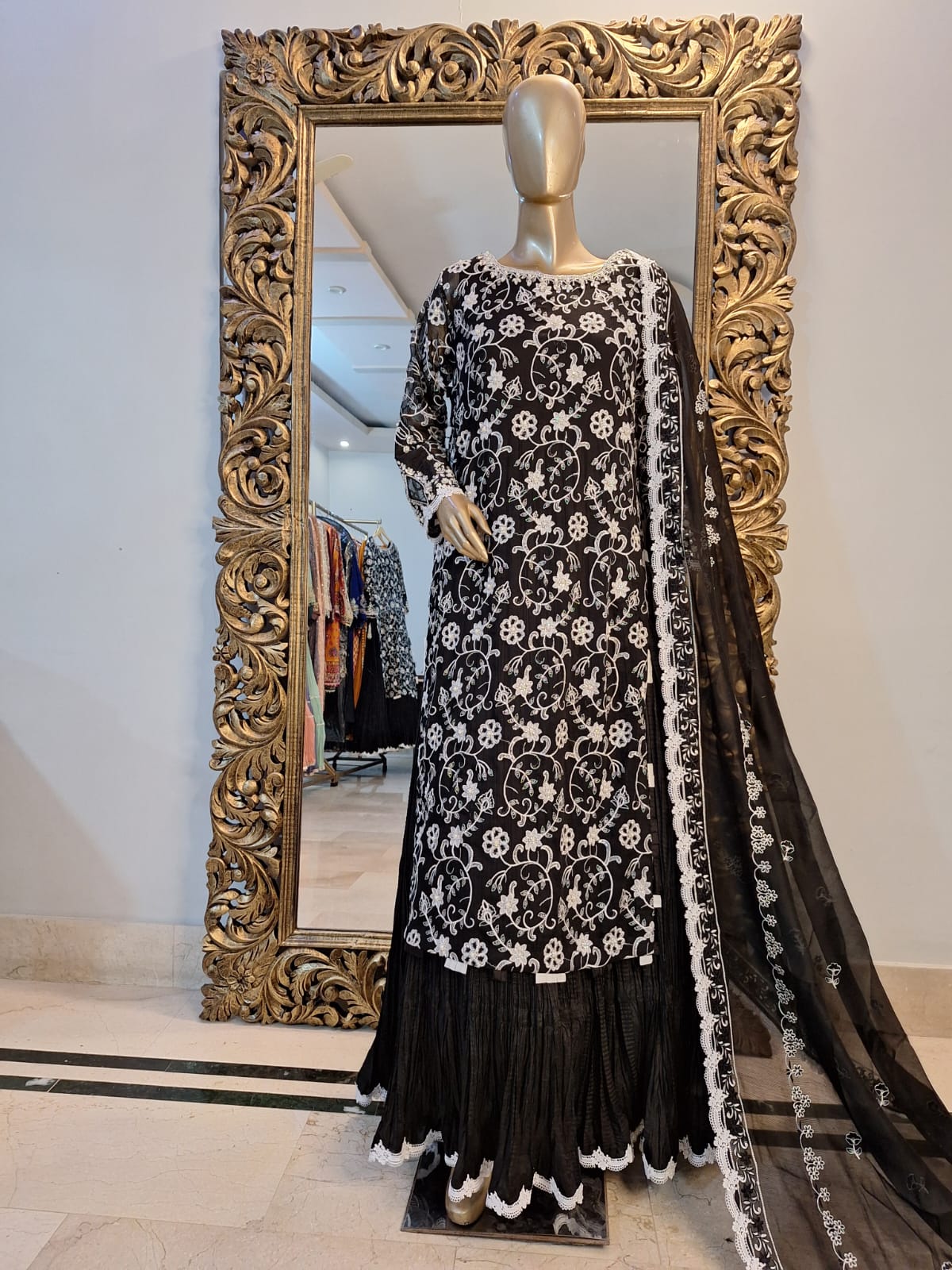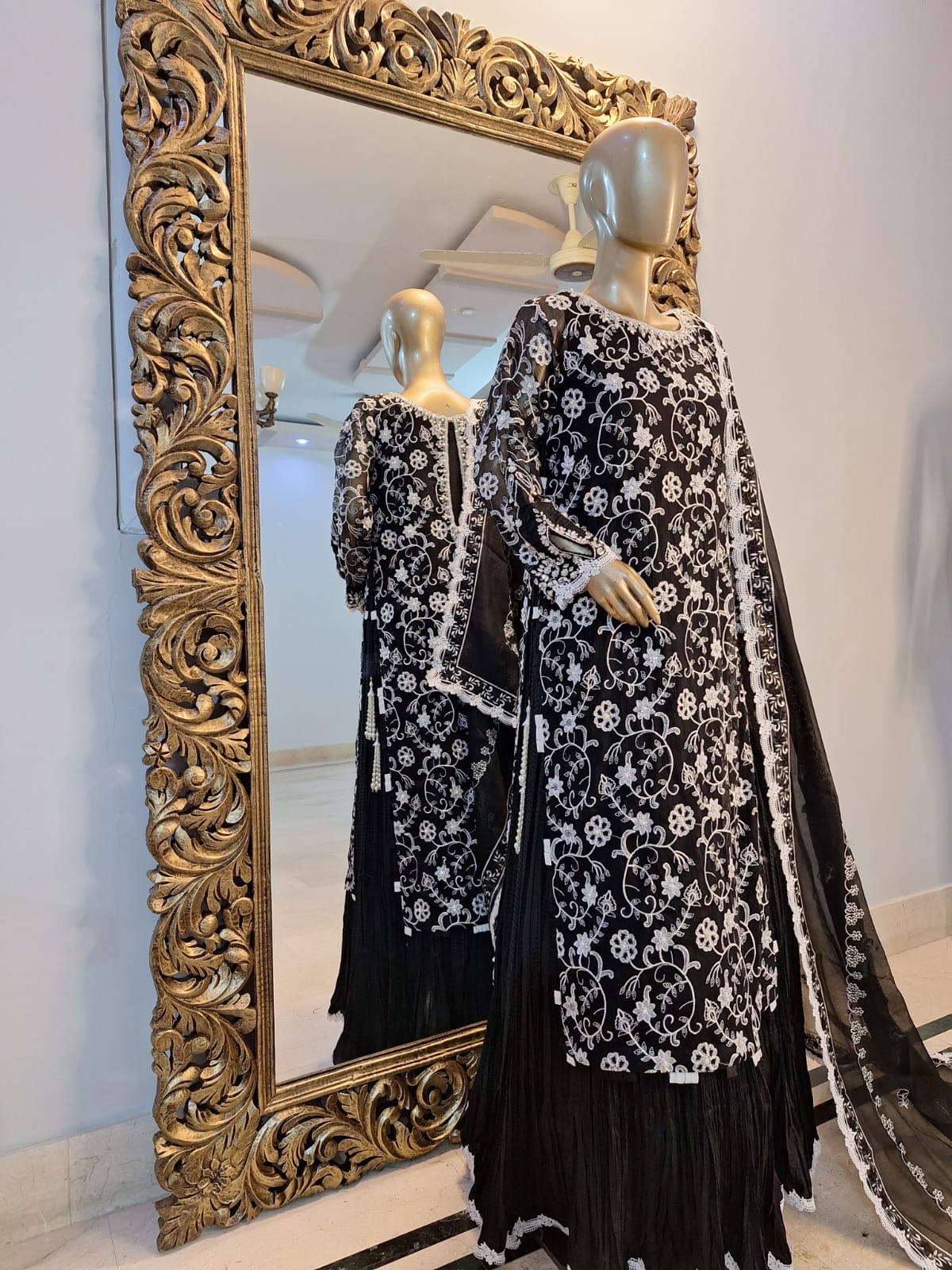 The black long gown with white floral thread work sounds absolutely stunning and elegant. The combination of crush silk and chiffon fabrics likely creates a beautiful drape and texture. Intricate machine work often adds a unique touch, showcasing exceptional craftsmanship. This gown would undoubtedly make a sophisticated statement at any special occasion. Overall, it sounds like a truly captivating and beautiful garment.