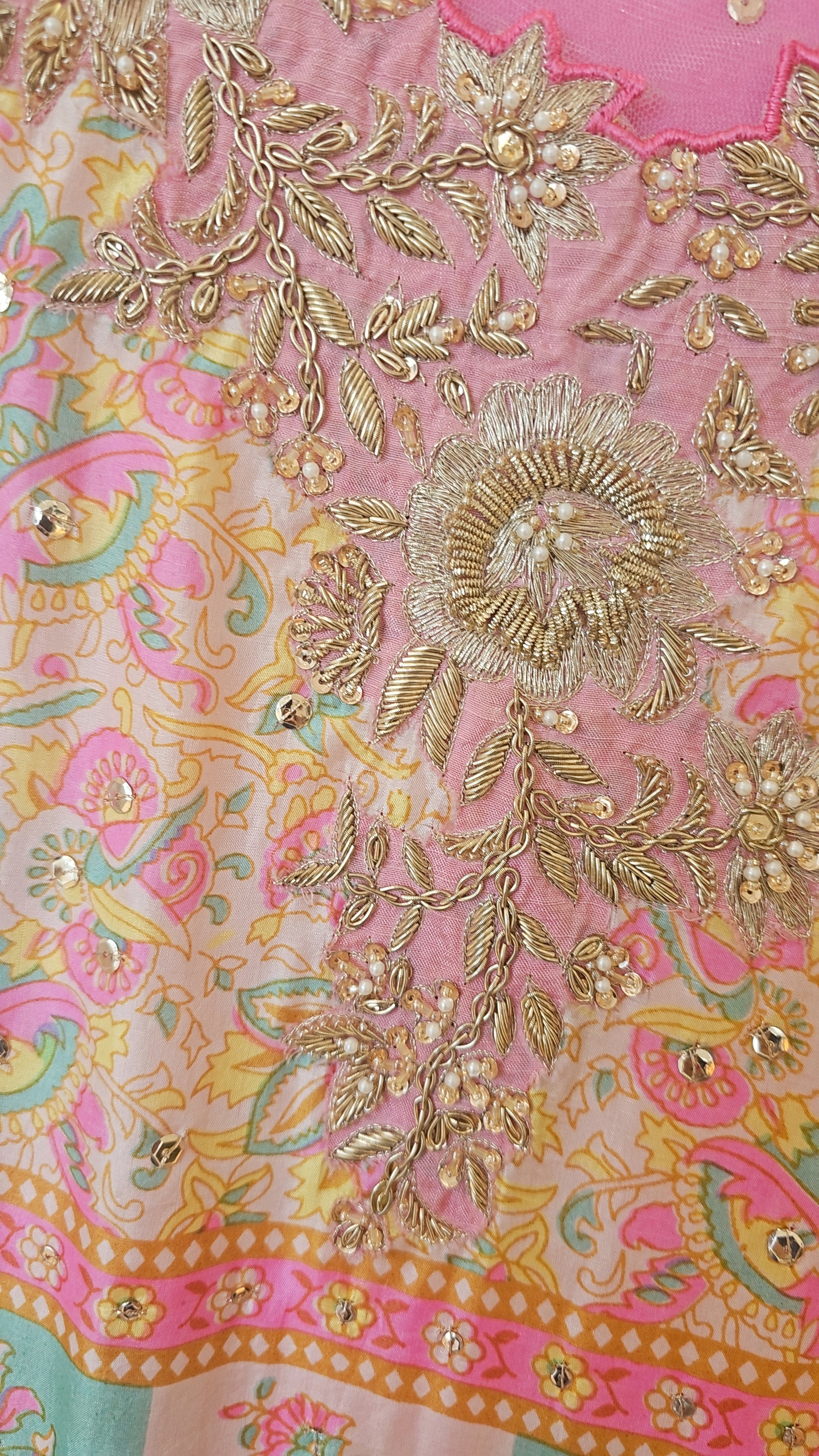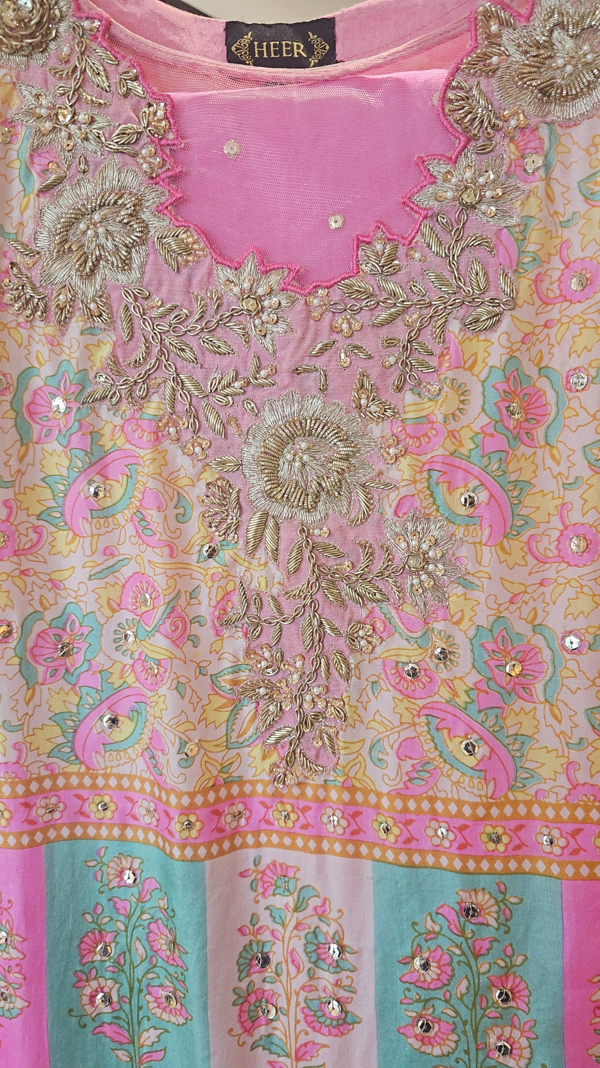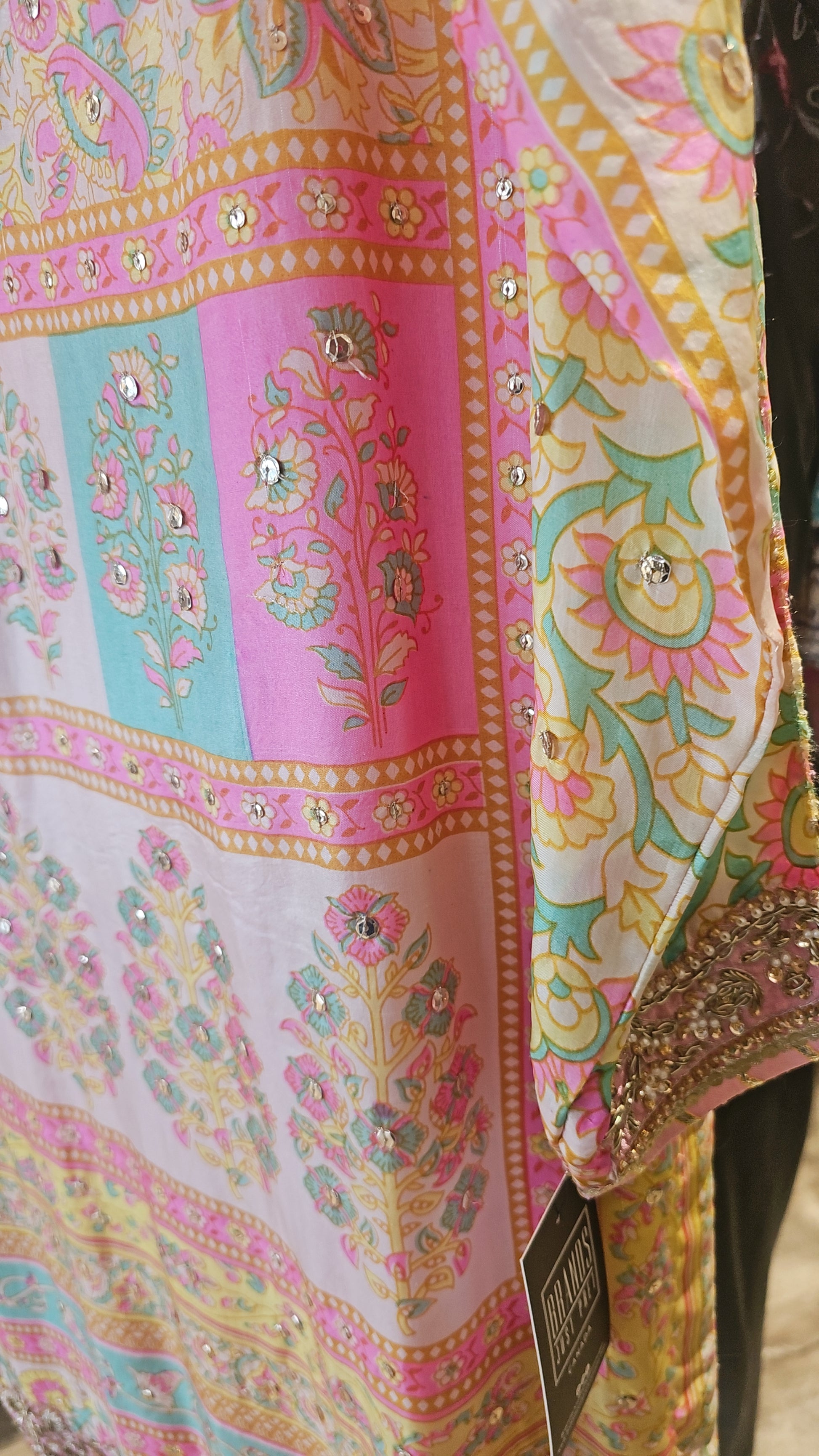 The exquisite silk outfit showcases a pure digital print, offering a visually stunning aesthetic. Intricate handwork elevates the ensemble, adding a layer of artistry and detail. Gota accents on the pants and dupatta introduce a touch of traditional elegance. This harmonious blend of modern printing techniques and classic embellishments creates a sophisticated look. The outfit is a testament to skilled craftsmanship and timeless design.