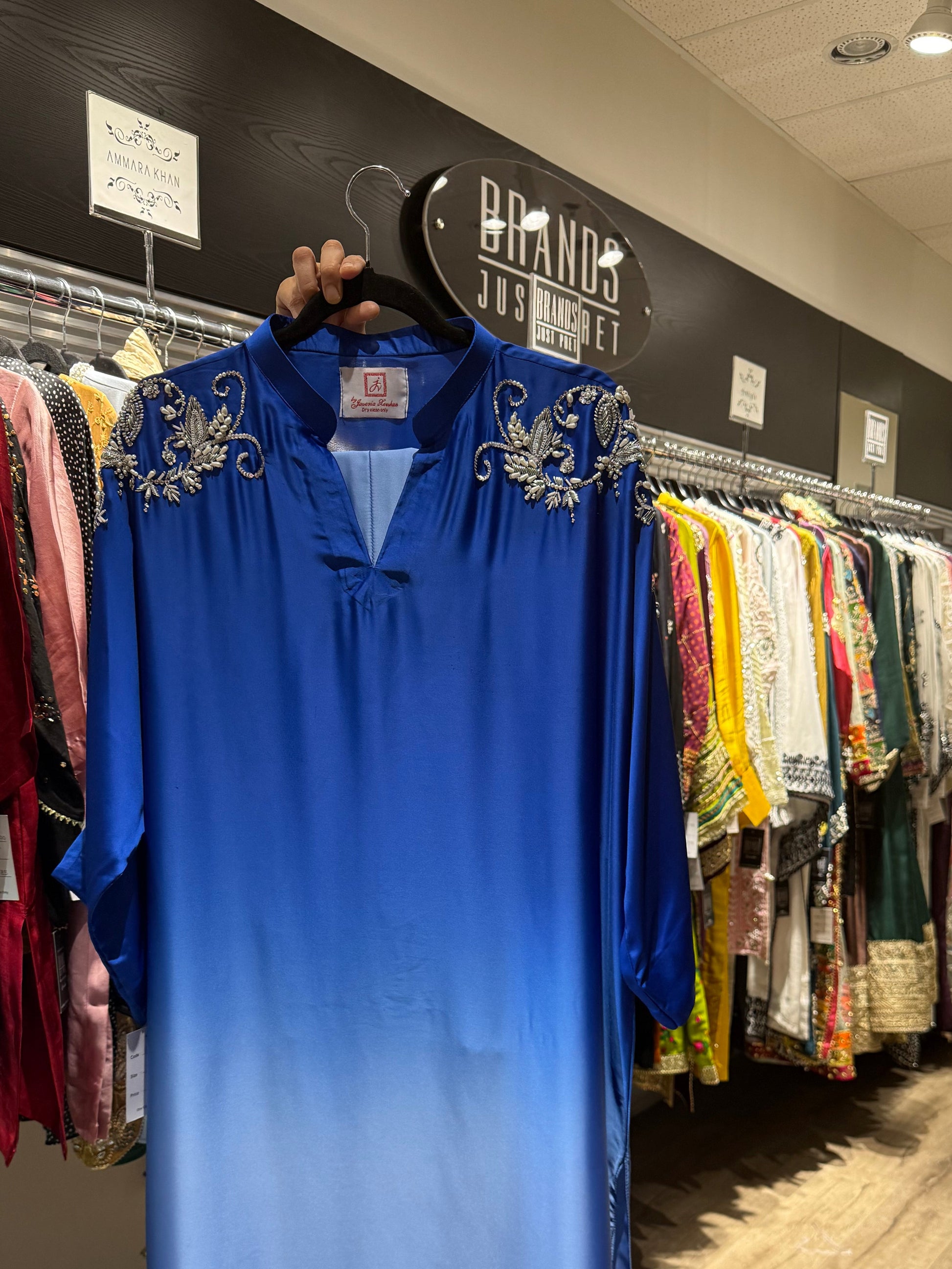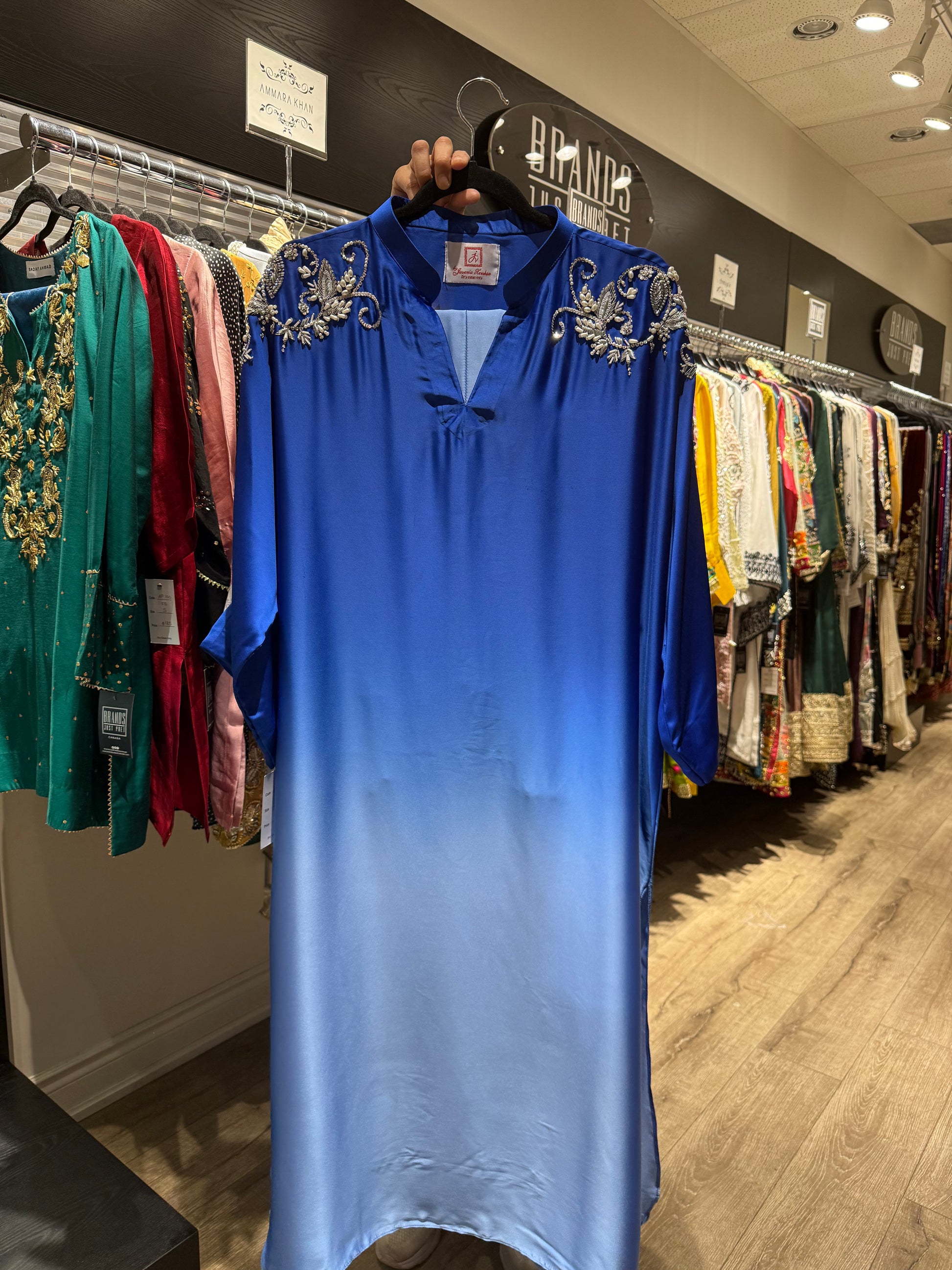 Graceful ombre blue coord set featuring soft flowy fabric and delicate silver embroidery on shoulders. Designed for effortless elegance, it offers a relaxed fit, modern silhouette, and versatile style perfect for festive gatherings, dinners, or chic everyday wear occasions.