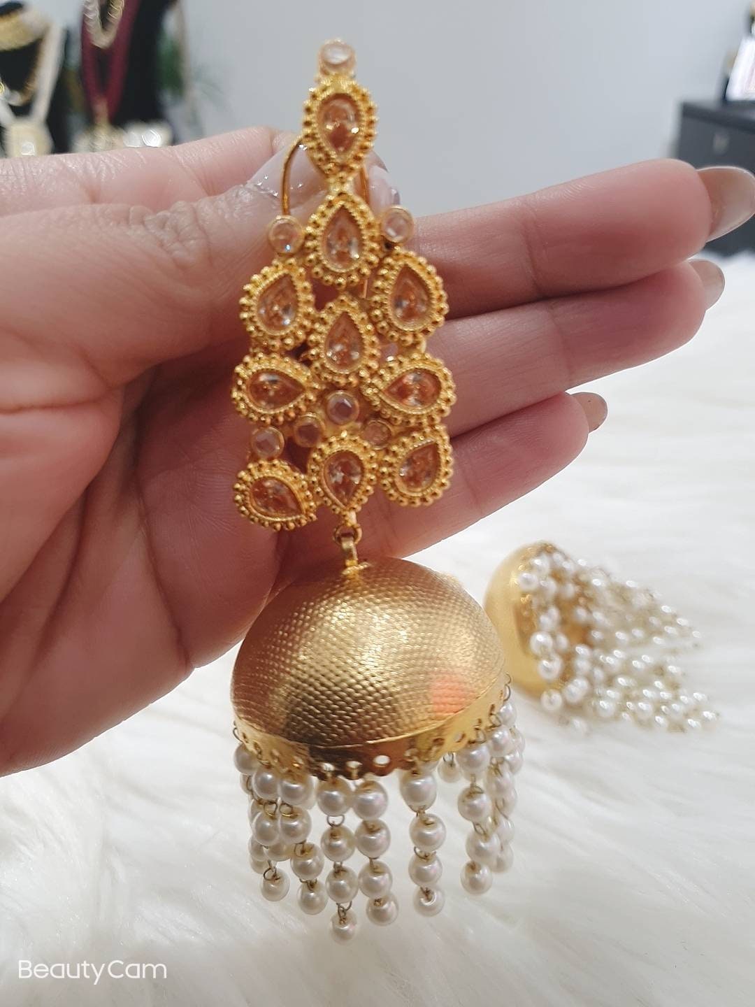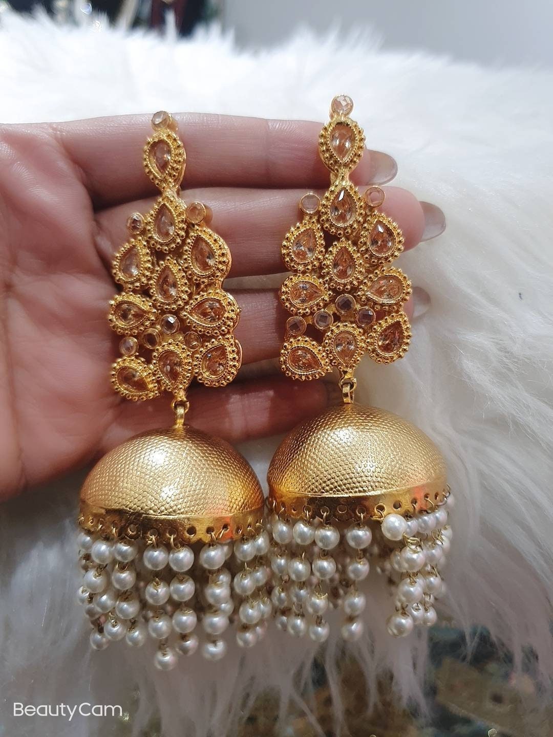 Semi Precious Gold Plated Long Jhumka with Champion stones
