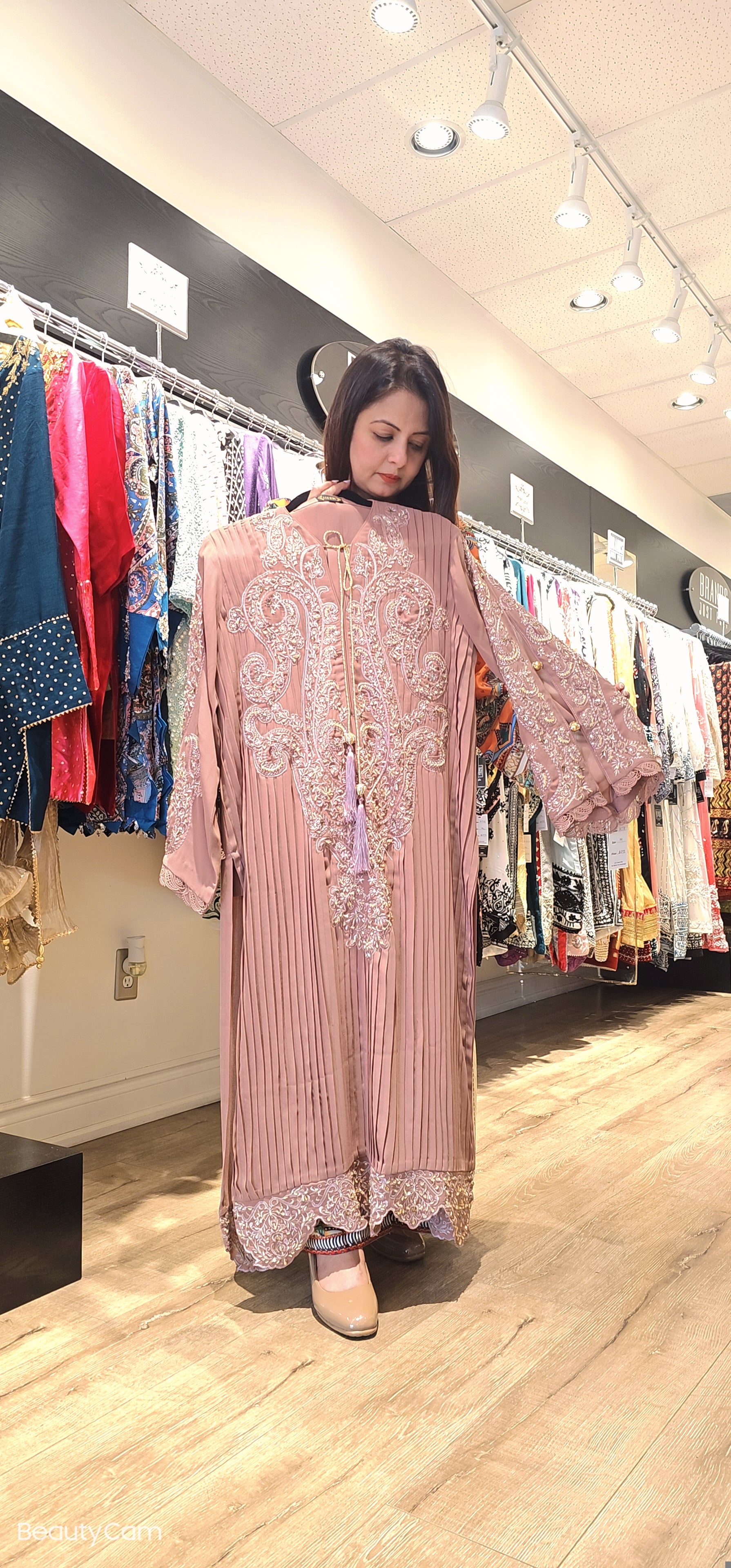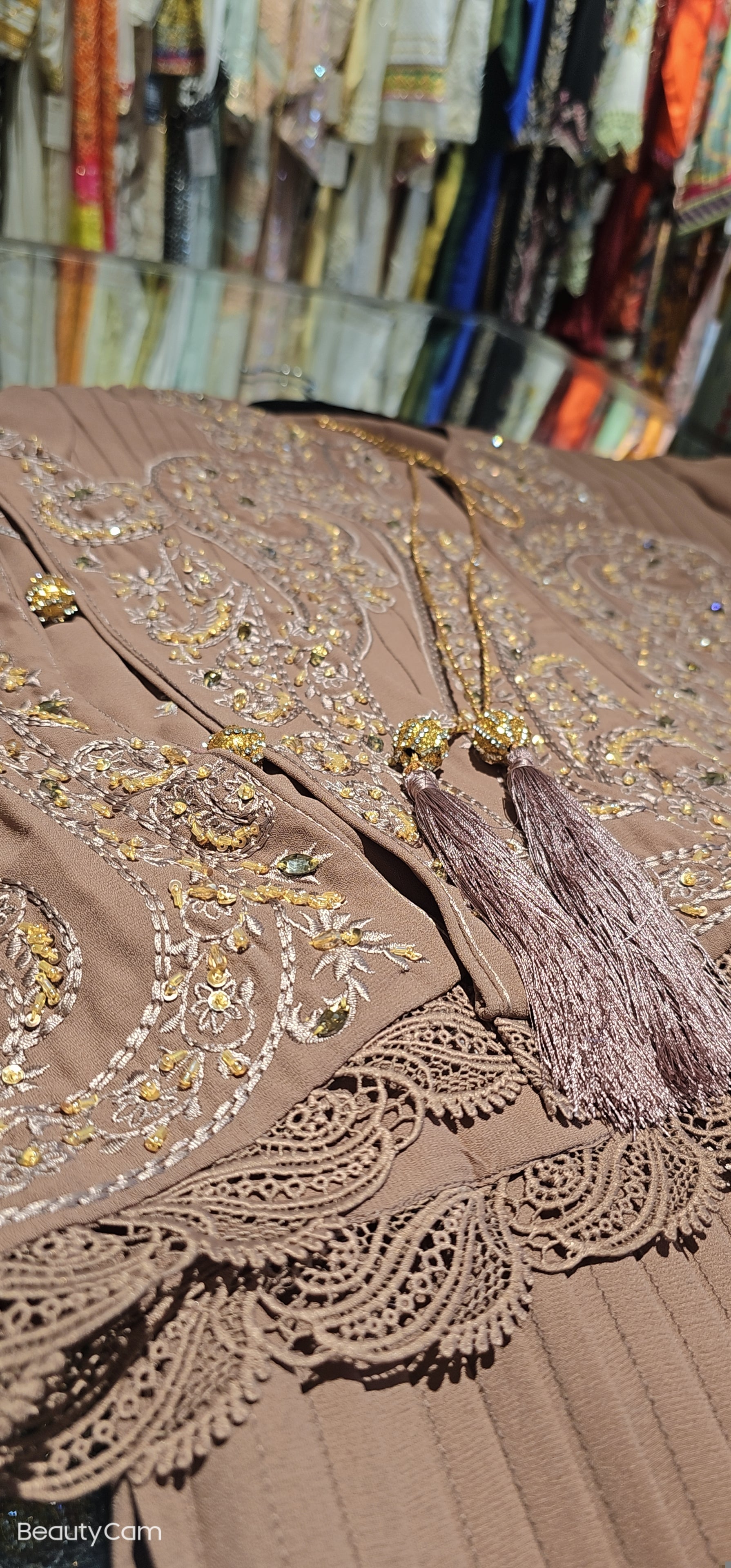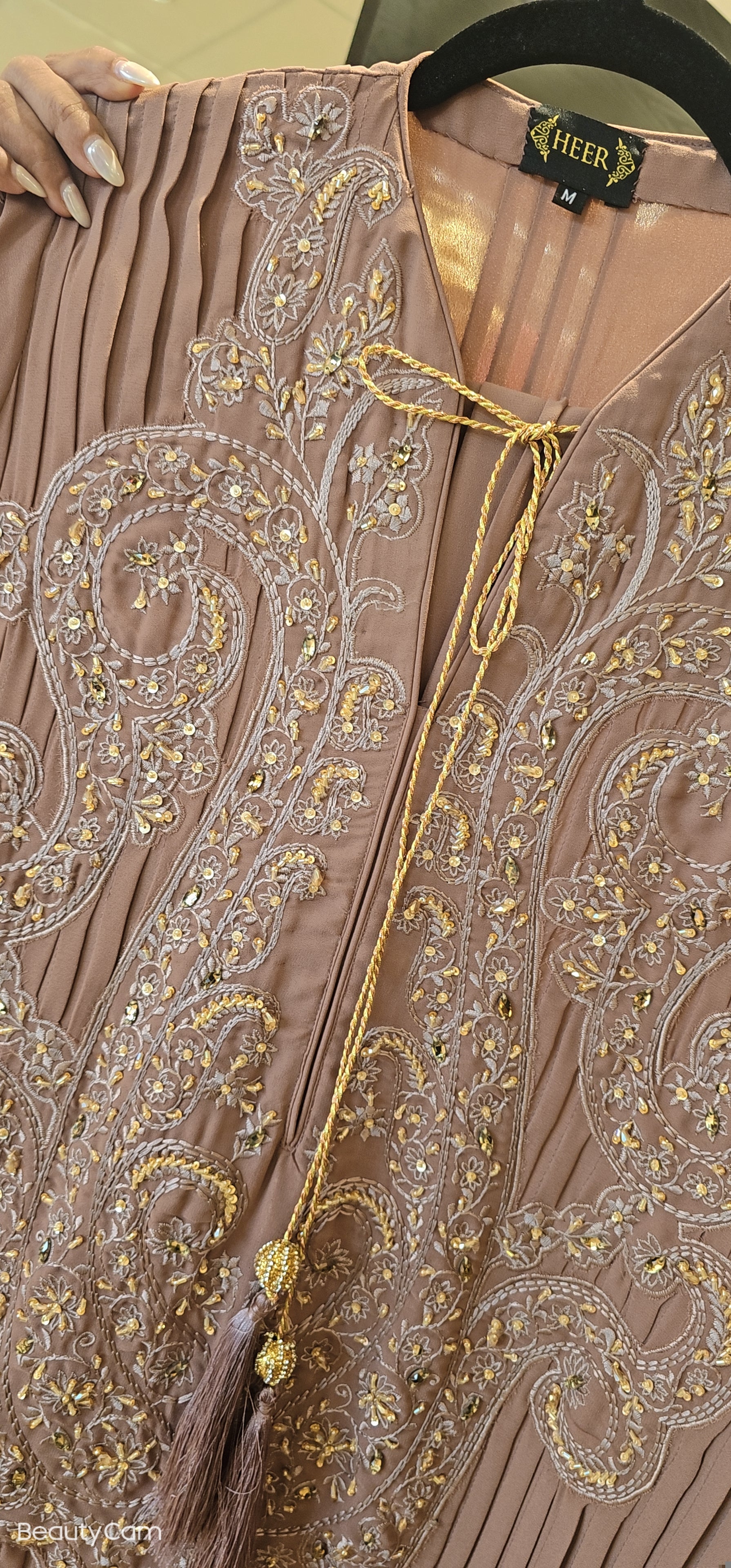 Elevate your wardrobe with this Liver Georgette outfit, crafted from lightweight, flowing georgette fabric for graceful movement and comfort. Its subtle liver shading adds a refined depth of color, making it an excellent choice for both formal and semi-formal occasions. Designed to drape elegantly, this outfit ensures a flattering silhouette while maintaining breathable wear throughout the day or evening. Perfect for those seeking sophistication with ease, it combines timeless style and expert tailoring.