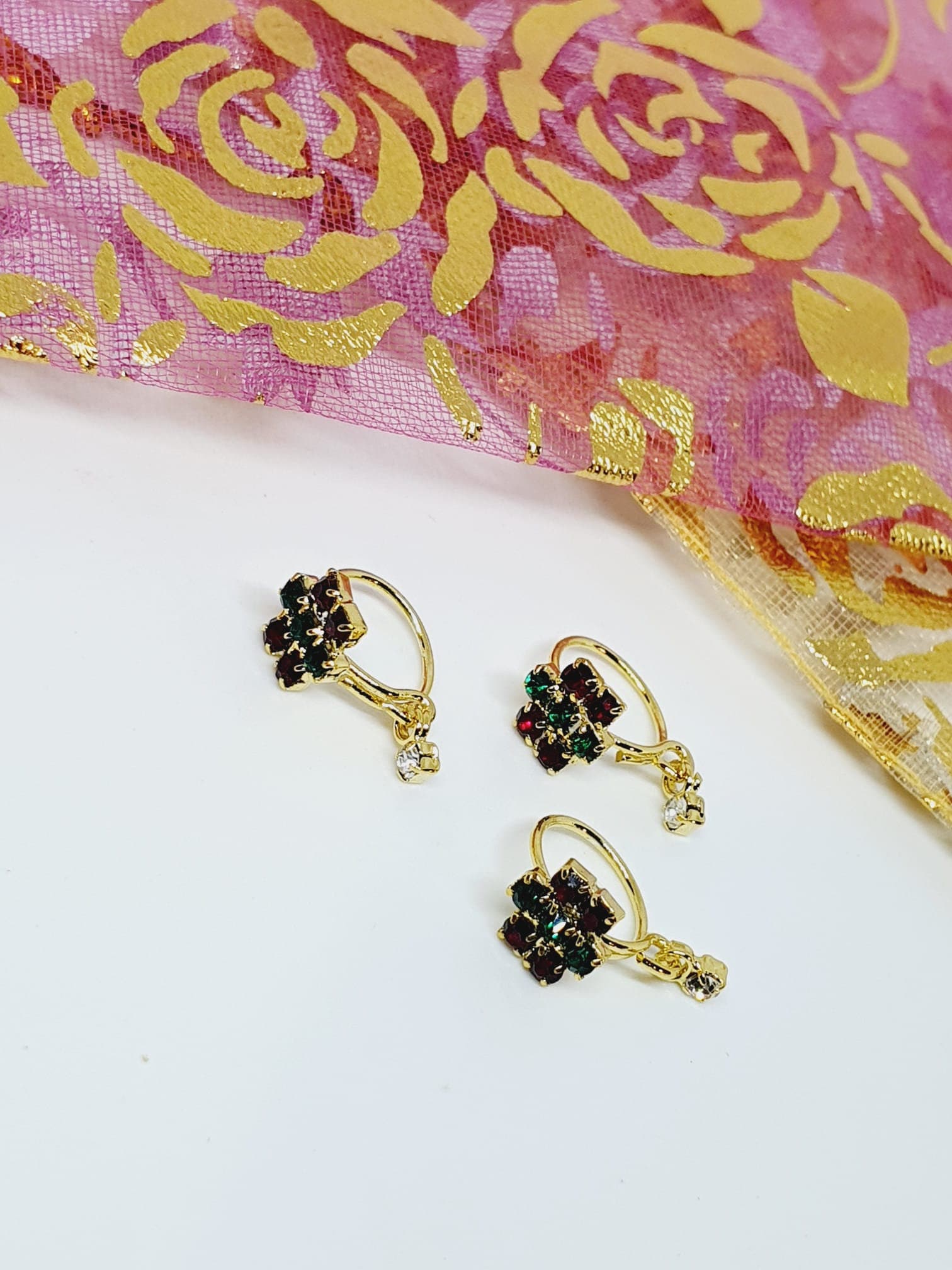 Multi Color 3 Dangle Stone, Nose Ring Gold Bollywood Wedding Indian Jewelry Women Pierced Nose Ring
