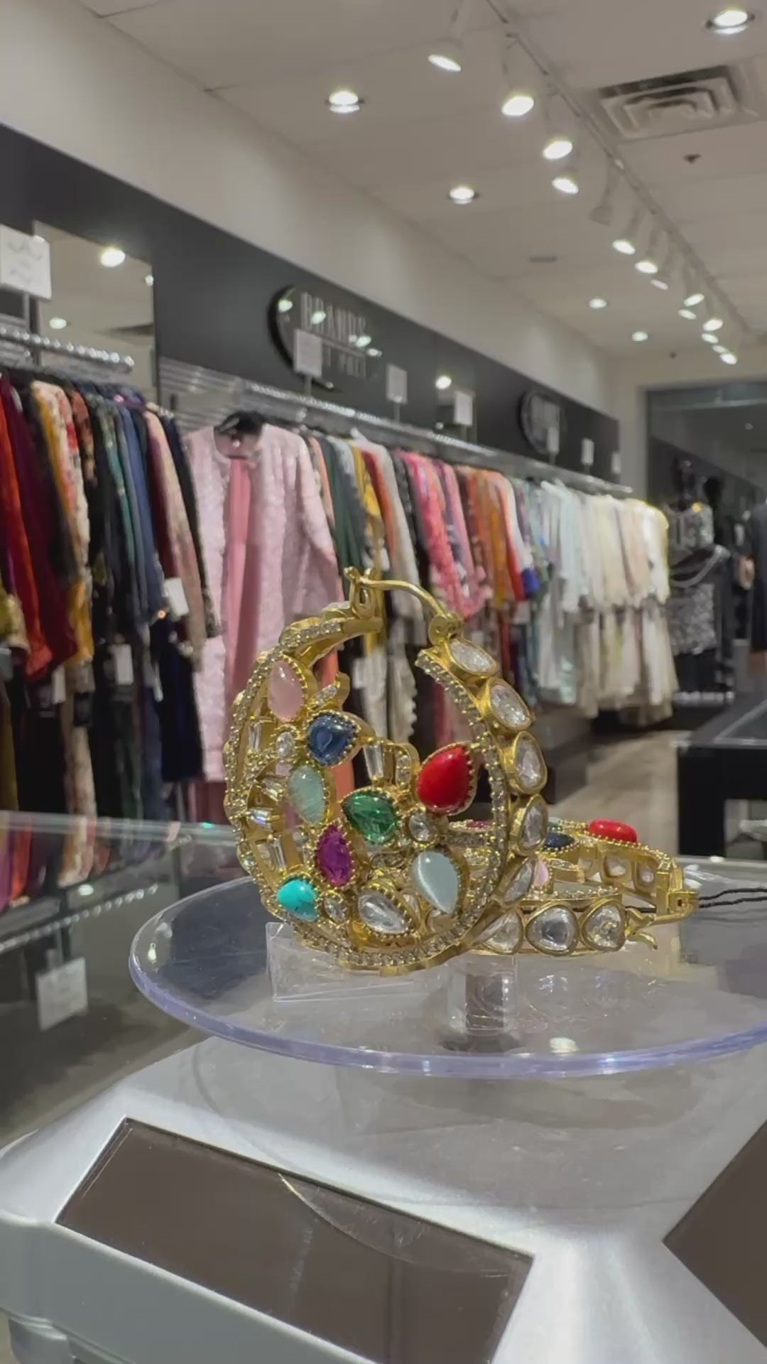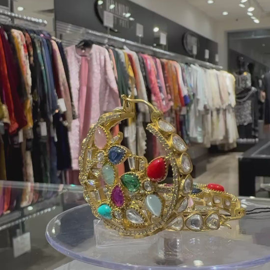 Elevate your look with these stunning multicolor stone gold hoop earrings, designed to add elegance and vibrant charm to any outfit. Crafted with a rich gold-tone finish, each earring features a beautiful arrangement of colorful stones including red, green, turquoise, and soft pastel shades. Sparkling crystal accents outline the hoop, creating a radiant shine from every angle. The crescent-inspired design offers a bold, luxurious appeal perfect for festive events, weddings, parties, or special occasions. Lightweight and comfortable, these earrings include a secure latch-back closure for all-day wear. A captivating accessory that blends tradition with contemporary style.