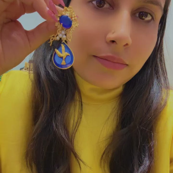 Featuring a vibrant royal blue base accented with intricate gold detailing, each earring is delicately adorned with a charming little bird motif, symbolizing grace and freedom. Lightweight and comfortable to wear, these earrings effortlessly complement both traditional and contemporary outfits, making them perfect for festive occasions, parties, or casual chic looks. The meticulous craftsmanship ensures every detail shines, creating a statement piece that draws attention without overwhelming your style. Elevate your jewelry collection with this unique blend of color, elegance, and whimsy.