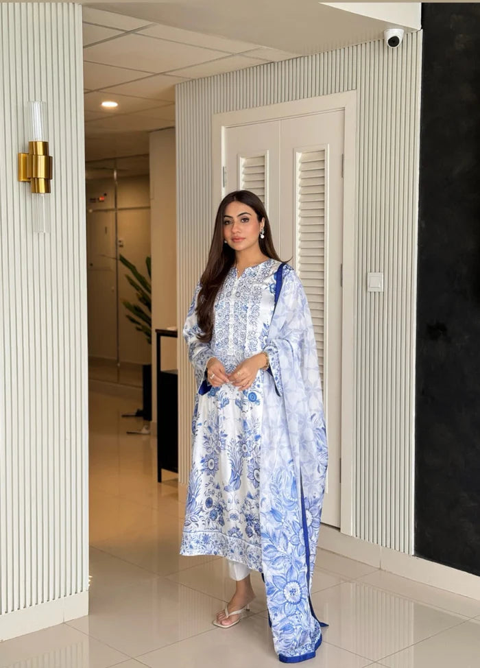 This 3 pc ensemble features a blue and white silk shirt adorned with intricate pearl sequence and rhinestones embellishments on the entire neckline. The printed chiffon dupatta is finished with royal blue piping on all four sides and paired with white pants. A sophisticated and elegant choice for formal occasions.