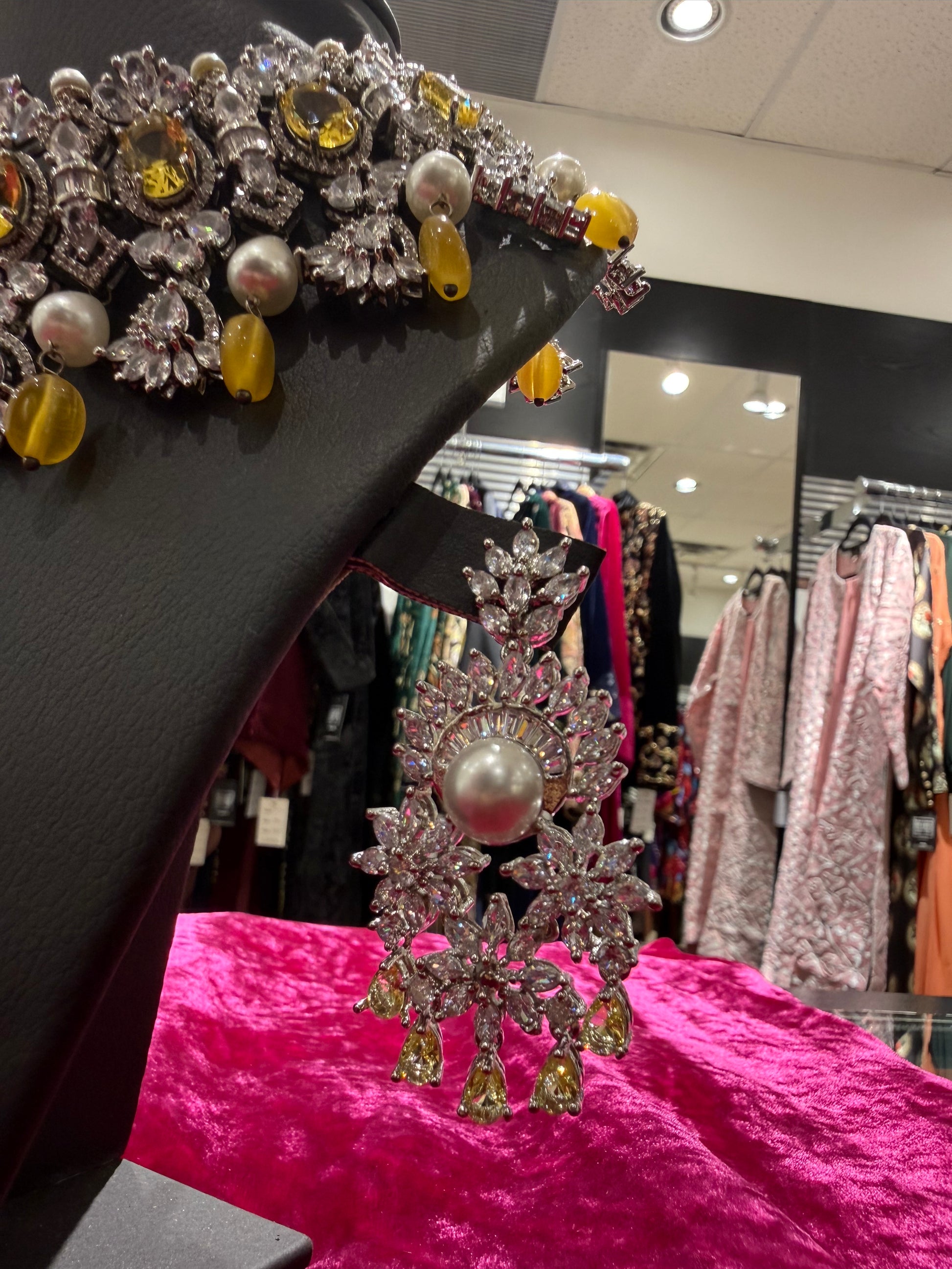 Elevate your festive and bridal look with this exquisite statement necklace set, crafted to capture timeless elegance. Featuring a luxurious silver-tone base, the necklace is adorned with sparkling crystal stones, radiant yellow accents, and graceful pearl drops that add a touch of royalty. Intricate floral and oval motifs create a rich, handcrafted appeal, making it perfect for weddings, receptions, and special occasions. The matching earrings complement the necklace beautifully, offering a complete and glamorous ensemble. Designed to stand out, this stunning set pairs effortlessly with traditional outfits, adding charm, sophistication, and unmatched sparkle to your look.